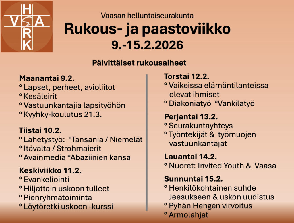 18.00 Rukoillaan yhdessä -ilta B-tilassa. Illan vetää Tomi Kuosmanen.