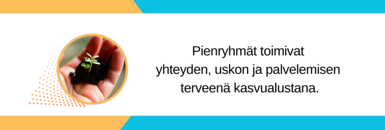 Pienryhmissä sinulla on mahdollisuus löytää ystäviä, kokea Jumalan läsnäoloa ja jakaa elämää yhdessä toisten kanssa. Ryhmissä on tilaa rennolle keskustelulle, Raamatun tutkimiselle ja yhteiselle rukoukselle. Ne tarjoavat tilan, jossa voimme rohkaista, tukea ja vahvistaa toinen toisiamme. Pienryhmät kokoontuvat useimmin kodeissa, mutta seurakunnassa on myös pienryhmiä, joissa kokoonnutaan esimerkiksi jonkin toiminnan ja tekemisen äärelle.