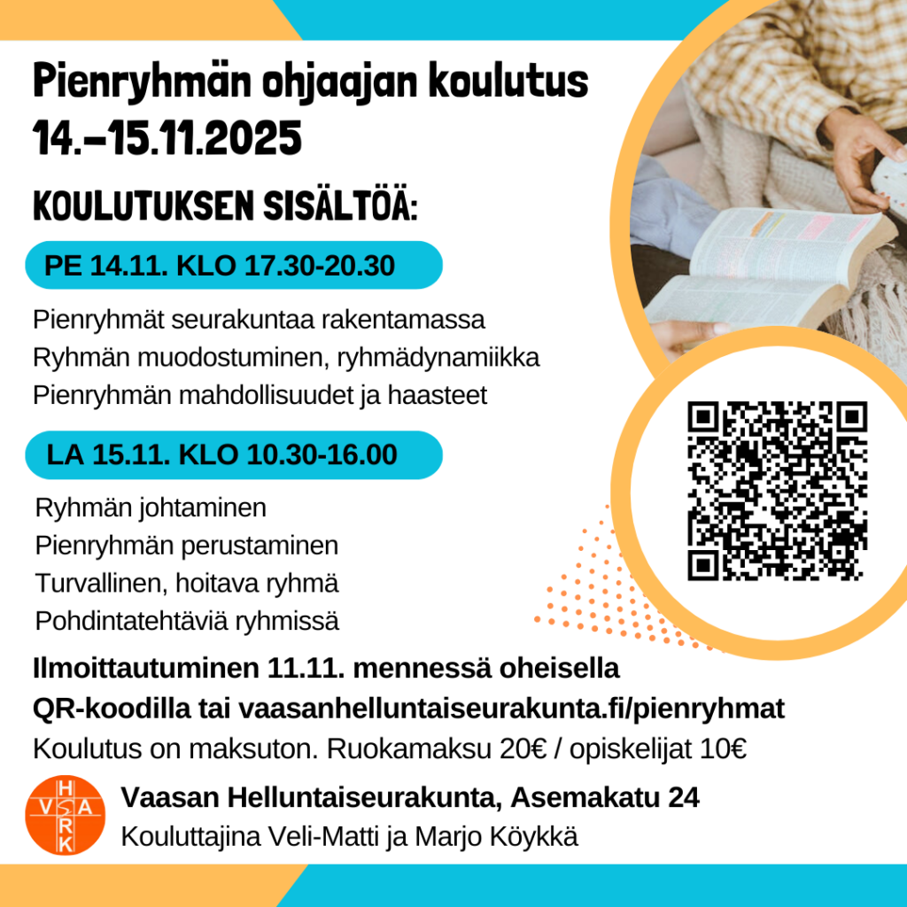 Järjestämme seurakunnassa pienryhmän ohjaajakoulutuksen pe-la 14.-15.11.2025. Koulutus on tarkoitettu pienryhmän ohjaajille, apuohjaajille sekä kaikille pienryhmätoiminnasta kiinnostuneille.